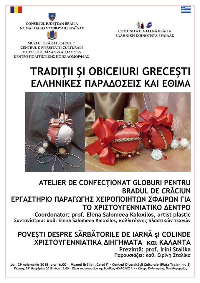 Joi, 29 noiembrie 2018, între orele 16.00 - 20.00, la Muzeul Brăilei „Carol I” - Centrul Diversităţii Culturale (Piaţa Traian nr. 3) a avut loc o activitate sub genericul „Tradiţii şi obiceiuri greceşti".