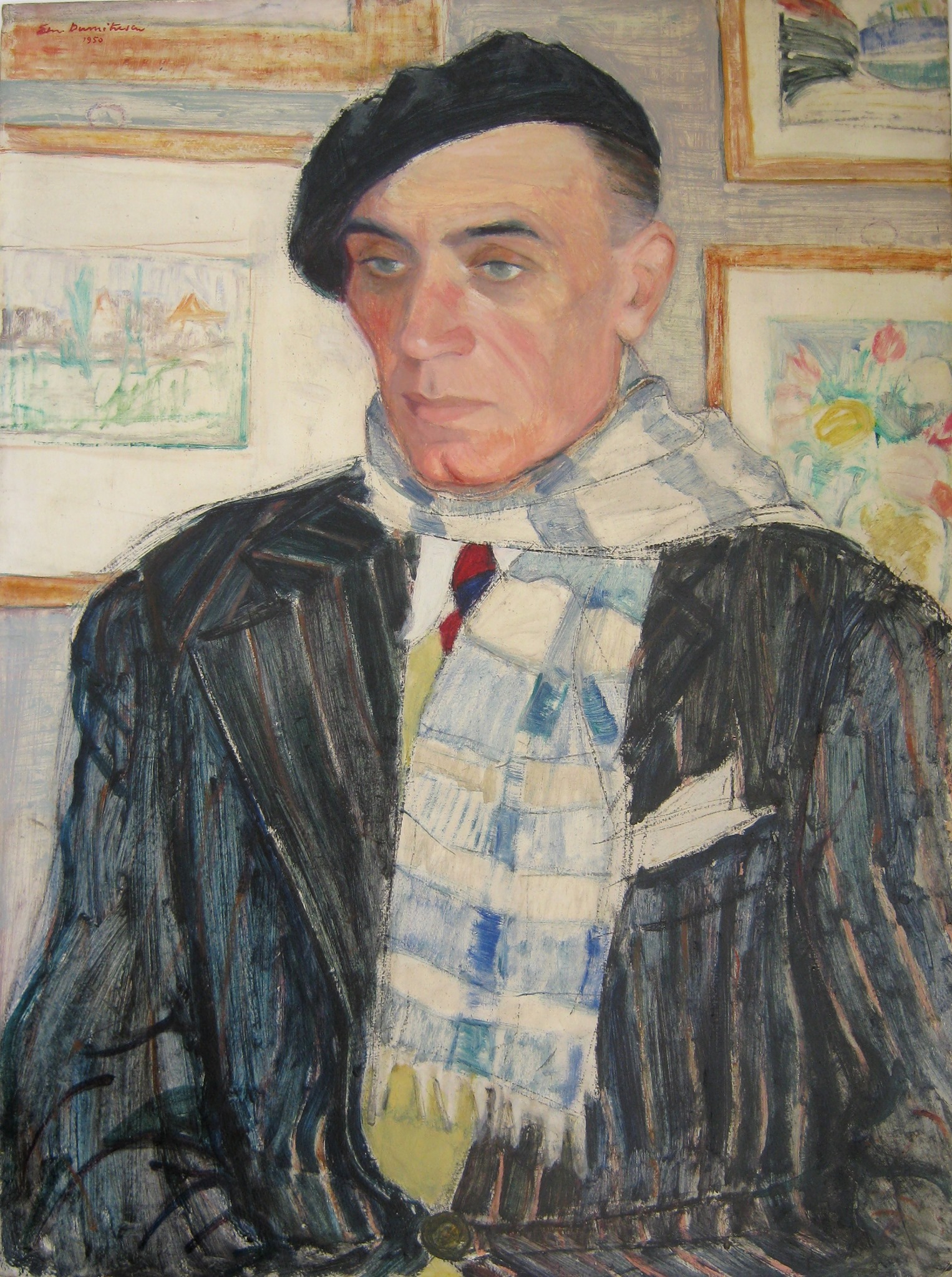 Emilia Dumitrescu | „Portretul pictorului Sorin Manolescu” | 1950 | cărbune, ulei şi pastel pe carton | Muzeul Brăilei „Carol I” – Sala „Atelier Sorin Manolescu”.