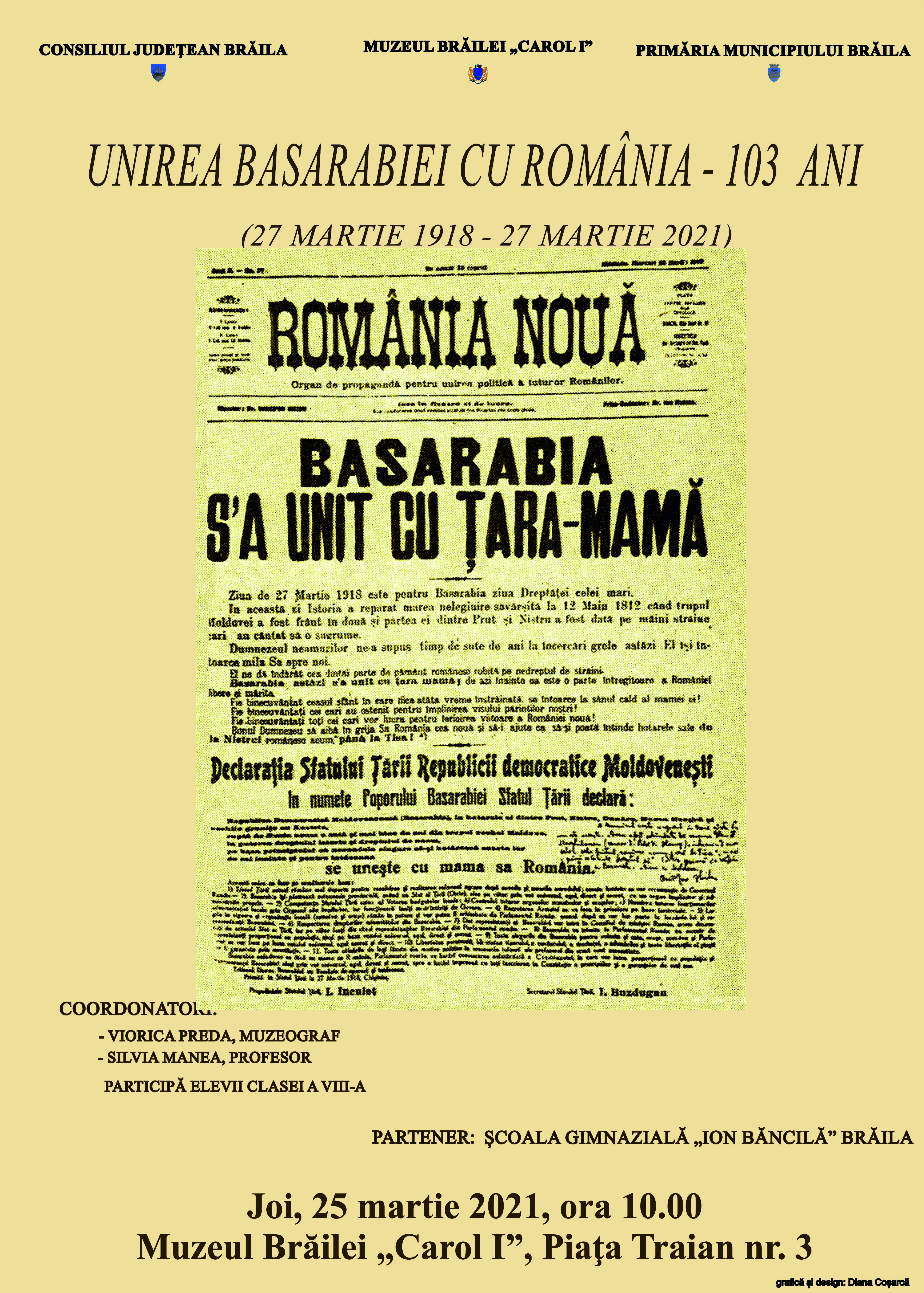 Muzeul Brăilei „Carol I” - Secția Istorie organizează joi, 25 martie 2021, începând cu ora 10, o dezbatere on-line dedicată împlinirii a 103 ani de la Unirea Basarabiei cu România (27 martie 1918), în colaborare cu Școala Gimnazială „Ion Băncilă” Brăila.