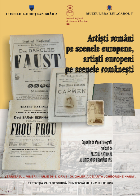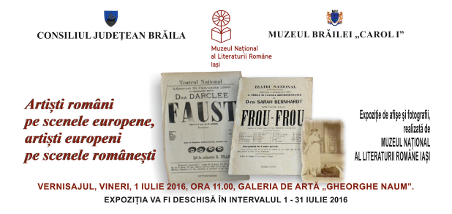 Muzeul Brăilei „Carol I” vă invită la vernisajul expoziţiei de fotografii şi afişe din secolul al XIX-lea, ARTIŞTI ROMÂNI PE SCENELE EUROPENE, ARTIŞTI EUROPENI PE SCENELE ROMÂNEŞTI - vineri, 1 iulie 2016, ora 11.00, la Muzeul Brăilei „Carol I” - Galeria de Artă „Gheorghe Naum” (Piaţa Traian 3, cu intrare prin str. Galaţi).