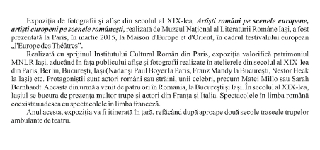 Expoziţia de fotografii şi afişe din secolul al XIX-lea, Artişti români pe scenele europene, artişti europeni pe scenele româneşti, realizată de Muzeul Naţional al Literaturii Române Iaşi, a fost prezentată la Paris, în martie 2015, la Maison d’Europe et d’Orient, în cadrul festivalului european „l’Europe des Théâtres”.