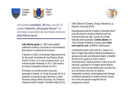Vă invităm sâmbătă, 30 mai, ora 17, în spaţiul Galeriei „Gheorghe Naum”, la vernisajul expoziţiei de ilustraţie semnate Iulia Maria Ignat.
