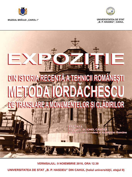 Muzeul Brăilei „Carol I”, în colaborare cu Universitatea de Stat „Bogdan Petriceicu Hașdeu” din Cahul organizează miercuri, 9 noiembrie 2016, vernisajul expoziţiei foto-documentare temporare „Din istoria recentă a tehnicii românești. Metoda Iordăchescu de translare a monumentelor și clădirilor”.