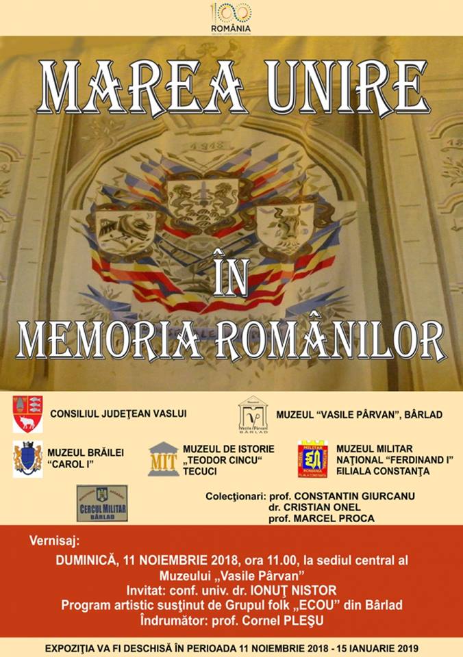 Consiliul Judeţean Vaslui şi Muzeul „Vasile Pârvan”, Bârlad vă invită la vernisajul expoziţiei „MAREA UNIRE ÎN MEMORIA ROMÂNILOR”, organizată la sediul central al muzeului.