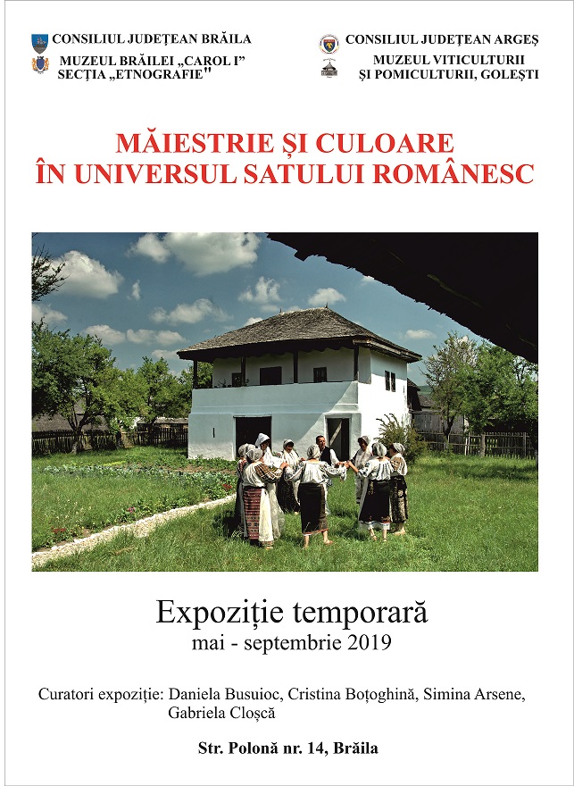 Muzeul Brăilei „Carol I”- Secția Etnografie și Muzeul Viticulturii și Pomiculturii Golești, jud. Argeș vă invită, joi 16 mai 2019, ora 11.30 la sediul din str. Polonă nr. 14, la vernisajul expoziției „Măiestrie și culoare în universul satului românesc”.