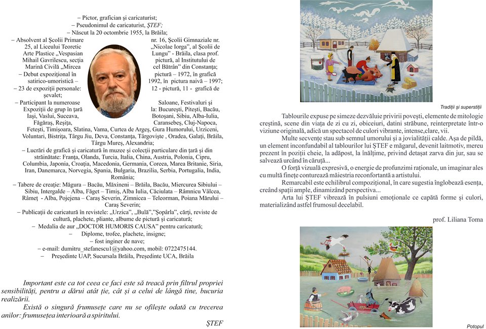 • Ora 18.00: Vernisajul expoziţiei temporare „Poveşti cu haz”, pictură naivă semnată Dumitru Ştefănescu Ştef. Prezintă: prof. Liliana Toma şi Eugenia Dumitriu, critic de artă.