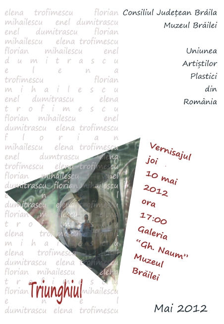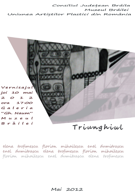 Muzeul Brăilei şi Uniunea Artiştilor Plastici Brăila vă invită joi, 10 mai 2012, ora 17.00, la Galeria „Gheorghe Naum” a Muzeului Brăilei, din Piaţa Traian nr. 3 (intrarea prin strada Galaţi), la vernisajul expoziţiei „Triunghiul”.Expoziţia cuprinde lucrări ale artiştilor plastici: Florian Mihăilescu, Elena Trofimescu şi Enel Dumitraşcu.
