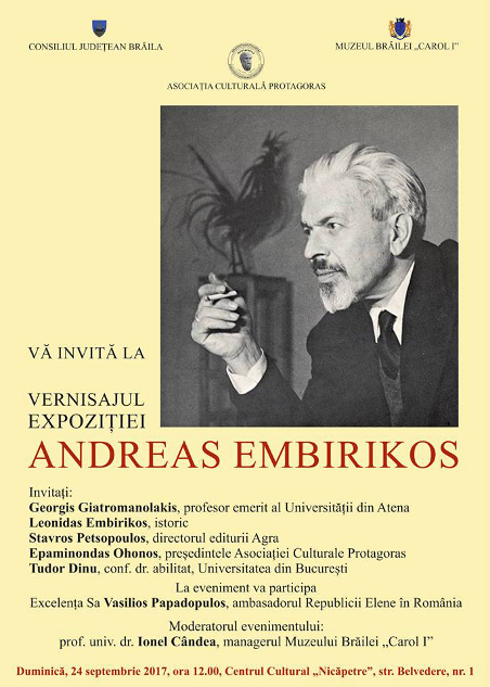 Muzeul Brăilei „Carol I” vă invită duminică, 24 septembrie 2017, ora 12.00, la Centrul Cultural „Nicăpetre” (str. Belvedere, nr. 1), la vernisajul expoziției „Andreas Embirikos”.