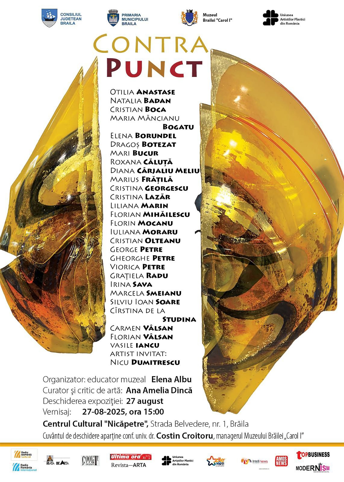 Vernisajul expoziției CONTRA PUNCT - miercuri, 27 august 2025, ora 15.00, la Muzeul Brăilei „Carol I” - Centrul Cultural Nicăpetre (str. Belvedere 1).