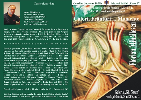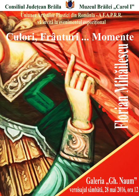 Muzeul Brăilei „Carol I” vă invită sâmbătă, 28 mai 2016, ora 12, la Galeria „Gh. Naum” din Piața Traian nr. 3 (intrarea prin str. Galați), la vernisajul expoziției "Culori, Frânturi…Momente" a artistului plastic Florian Mihăilescu. Evenimentul este organizat în colaborare cu Uniunea Artiștilor Plastici din România – A. F.A. P. R. R.