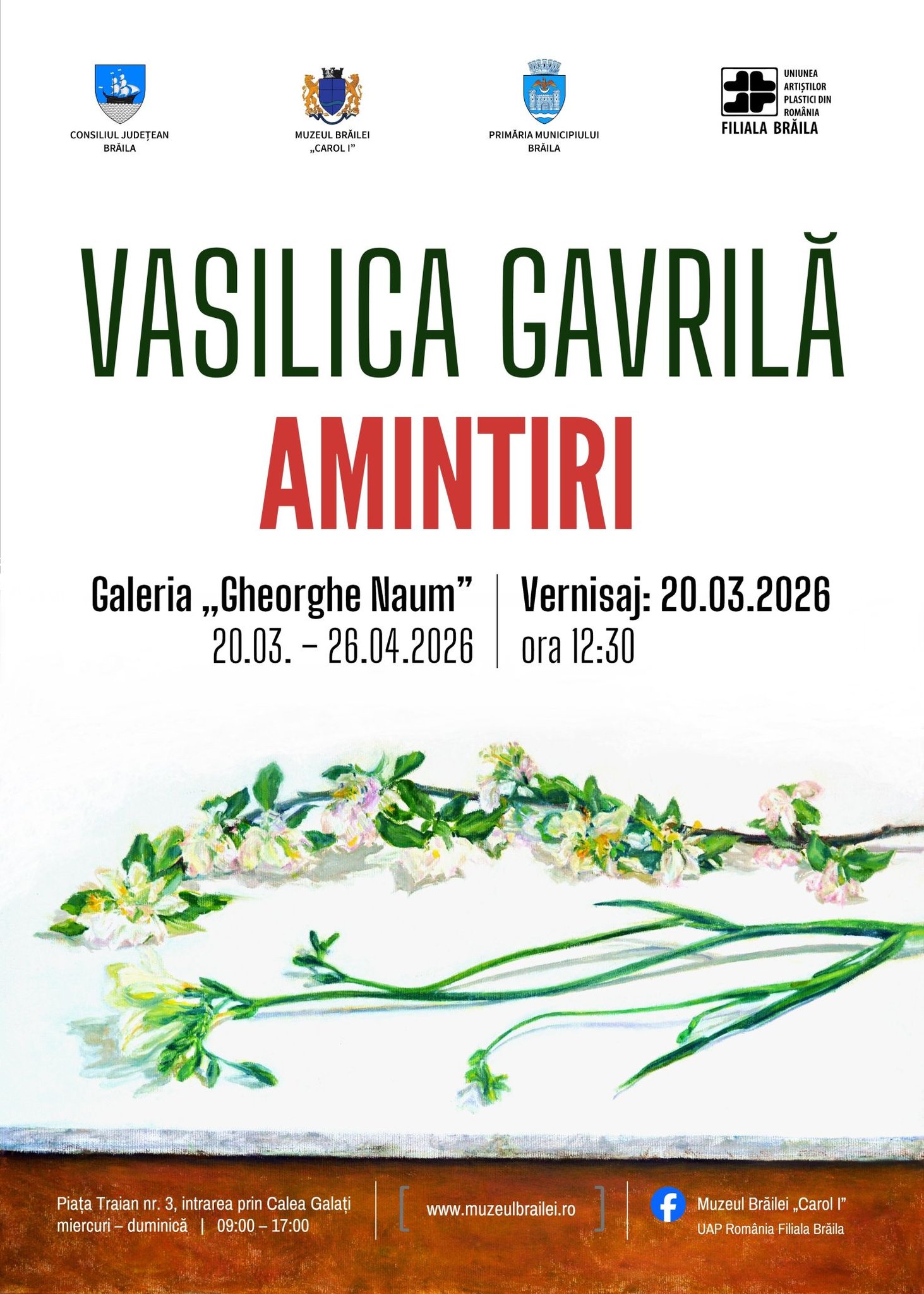 Muzeul Brăilei „Carol I” vă invită vineri, 20 martie, începând cu ora 12:30, în spațiul Galeriei „Gheorghe Naum”, la vernisajul expoziției de pictură „Amintiri” a pictoriței Vasilica Gavrilă.