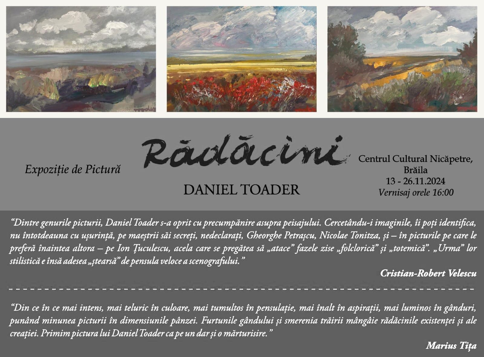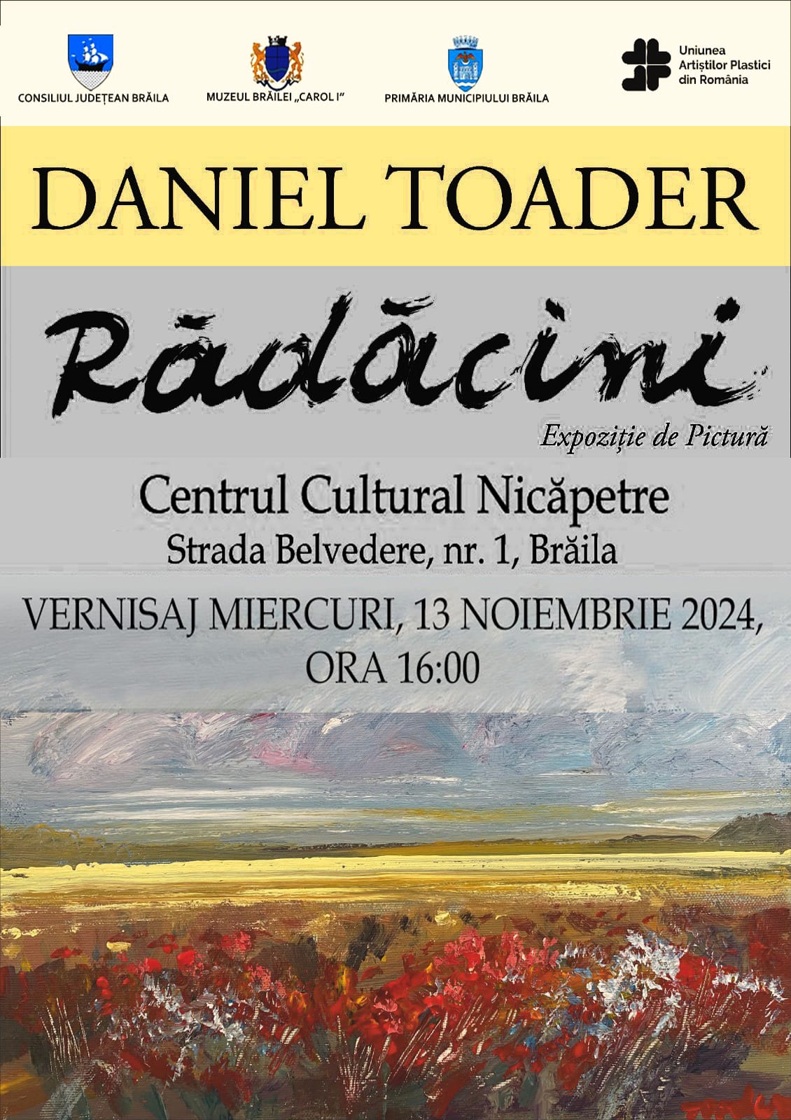 Vernisajul expoziției de pictură „Rădăcini” a artistului plastic Daniel Toader - miercuri, 13 noiembrie 2024, ora 16:00, la Muzeul Brăilei „Carol I” - Centrul Cultural Nicăpetre (str. Belvedere, nr.1).