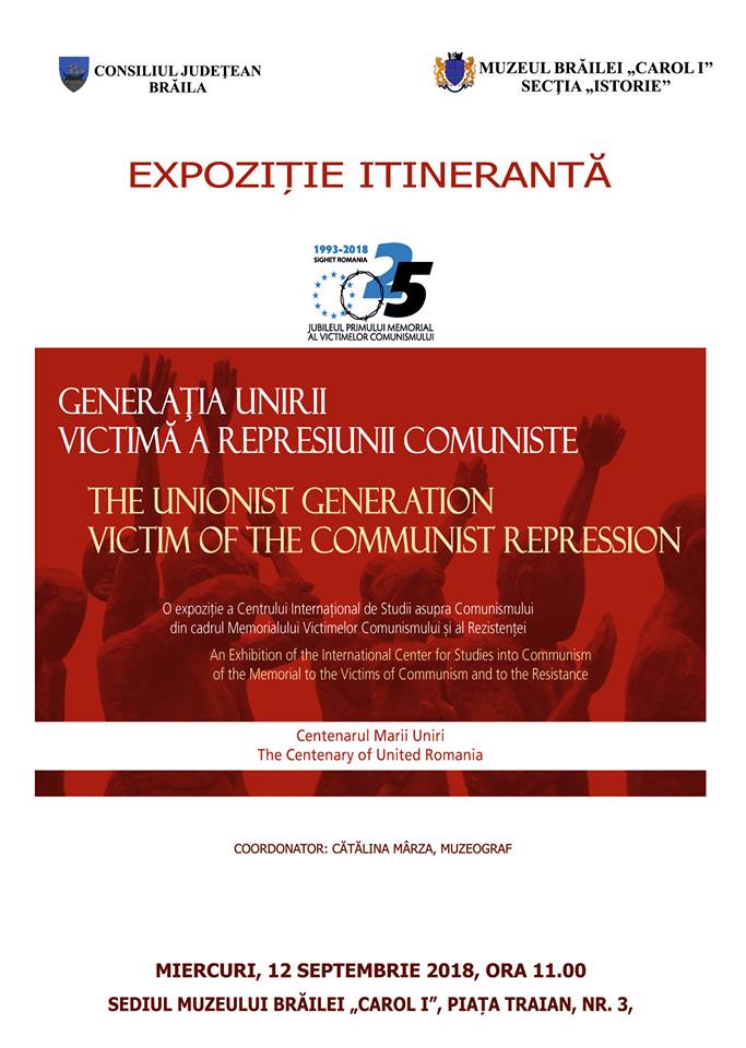 Vernisajul expoziției itinerante „Generația Unirii victimă a represiunii comuniste" a avut loc miercuri, 12 septembrie 2018, ora 11.00, la sediul Muzeului Brăilei „Carol I” din Piața Traian, nr. 3 .