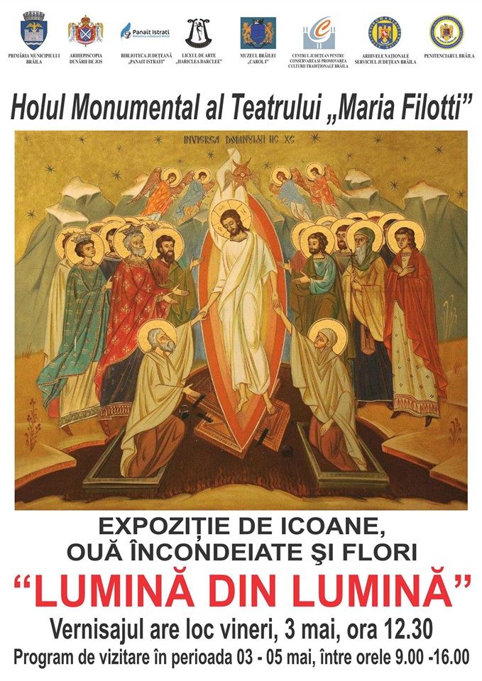 Vernisajul expoziției „Lumină din Lumină” va avea loc vineri, 3 mai 2019, ora 12.30, la Teatrul „Maria Filoti”.