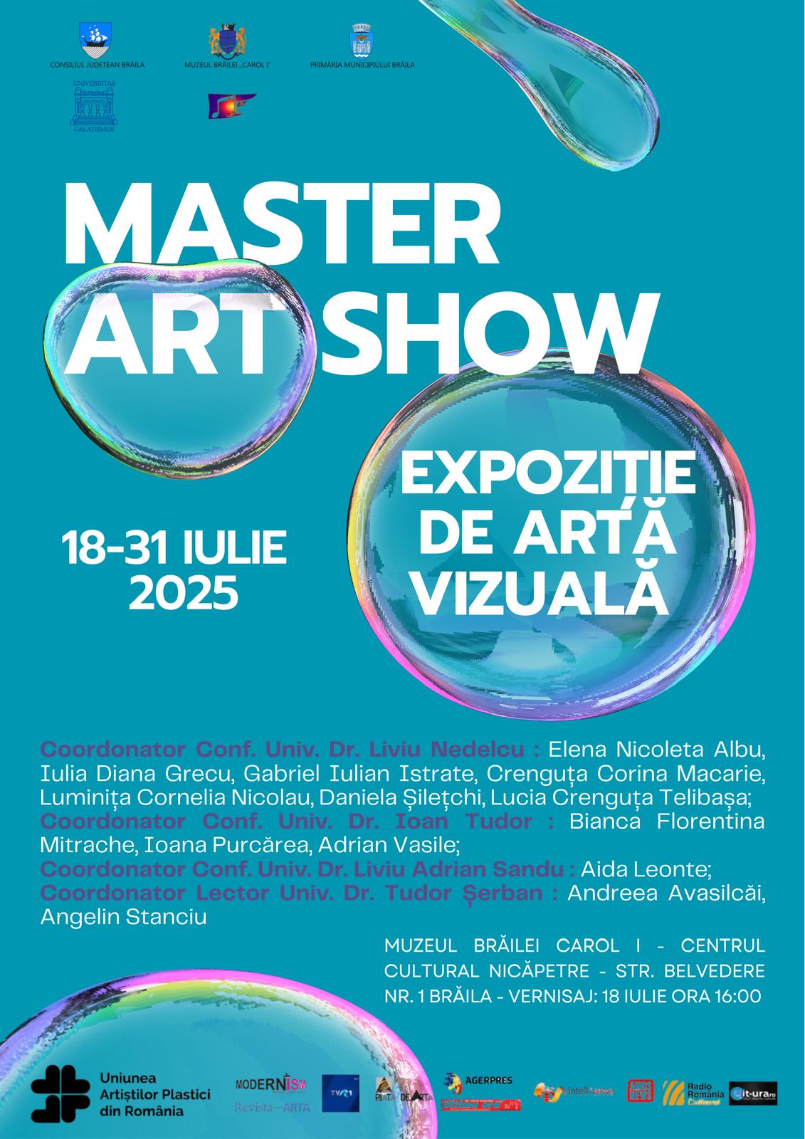 Expoziția MASTER ART SHOW, a cărei deschidere a avut loc, vineri, 18 iulie 2025, la Centrul Cultural Nicăpetre (Str. Belvedere, nr. 1) din cadrul Muzeului Brăilei „Carol I”, este un proiect artistic care reunește pe simeze lucrările absolvenților Programului de studii Master - Pictură al Facultății de Arte din cadrul Universității „Dunărea de Jos” din Galați sub coordonarea: