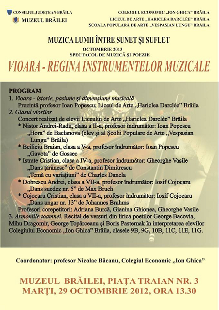 Marți, 29 octombrie 2013, ora 13.30, Muzeul Brăilei (Piața Traian nr. 3) este gazda unui spectacol de muzică și poezie realizat în cadrul proiectului „Muzica lumii între sunet și suflet”, tema ediției 2013 fiind „Vioara – regina instrumentelor muzicale”.