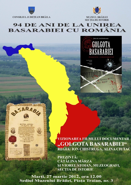 Cu ocazia împlinirii a 94 de ani de la Unirea Basarabiei cu România, Muzeul Brăilei - Secţia "Istorie" vă invită marţi, 27 martie 2012, ora 12.00, la sediul din Piaţa Traian nr. 3, să vizionaţi filmul documentar "Golgota Basarabiei" - regia: Ion Chistruga şi Alina Ciutac (101 min.).