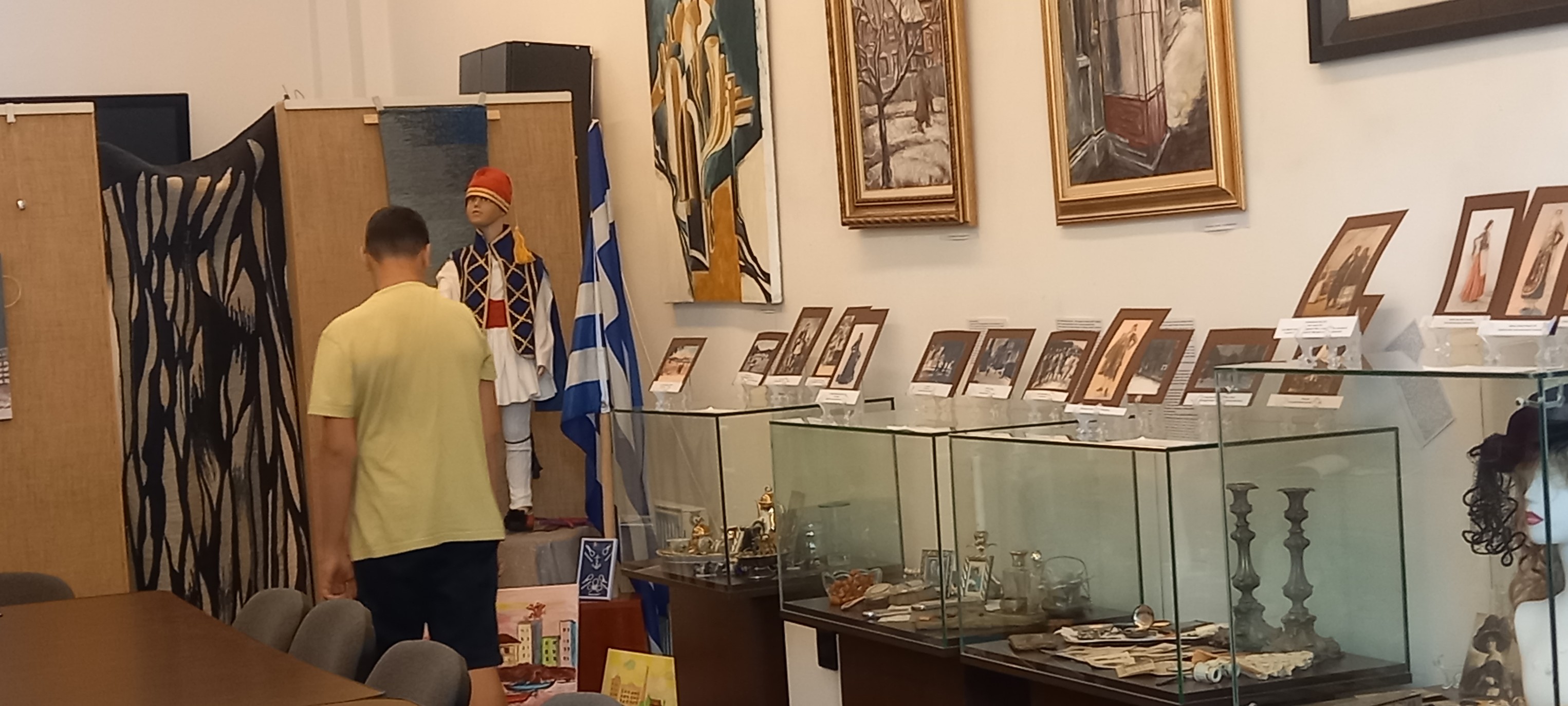 Camelia Hristian, șef Serviciul Relații Publice a prezentat expozițiile temporare OBIECTE din sec. XIX de la Biserica Buna Vestire „Greacă” Brăila și din scrinul cu amintiri de la familii membre ale Comunității Elene Brăila: Beatrice Dobrescu (Ispir), Florentina Mușat, Elena Salomeea Kaloxilos Moraru, Jana Andreescu, Marilena Ioanid | LUCRĂRI DE ARTĂ semnate de artiştii plastici (din Brăila, Galați, Brașov și București): Jana Andreescu, Gheorghe Andreescu, Irina Ariton, Marilena Ioanid, Irina Ionescu Berechet, Elena Salomeea Kaloxilos Moraru, Gheorghe Mosorescu, Iulia Pastorcici, Dennis Teodorescu, Marius Teodorescu, Traian Tsamuris | FOTOEXPOZIȚIE „INCURSIUNE ÎN VESTIMENTAȚIA GREACĂ, ÎN SEC. XVI - XX”. Documentare: Camelia Hristian - deschisă cu ocazia Zilei Naționale a Greciei | „Peisajul fluvial brăilean”. Lucrări pe pânză realizate de elevi în Proiectul educațional județean „Peisajul brăilean în culoare, credință și lectură” - dedicată Zilei Internaționale a Dunării.