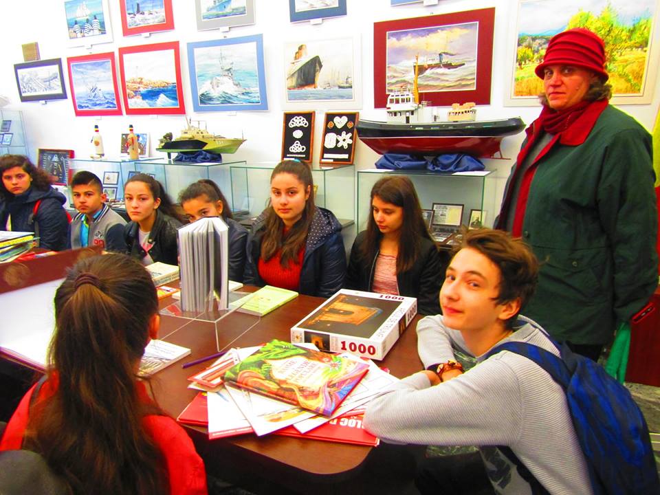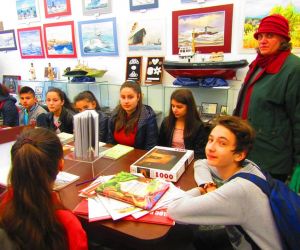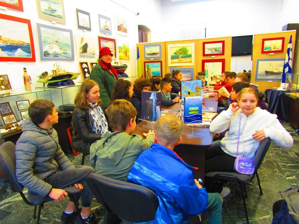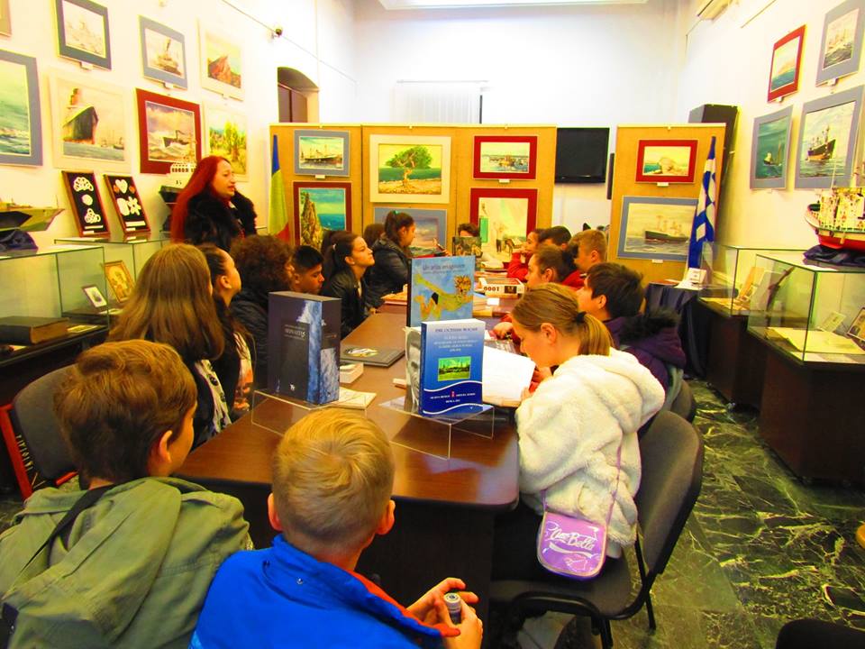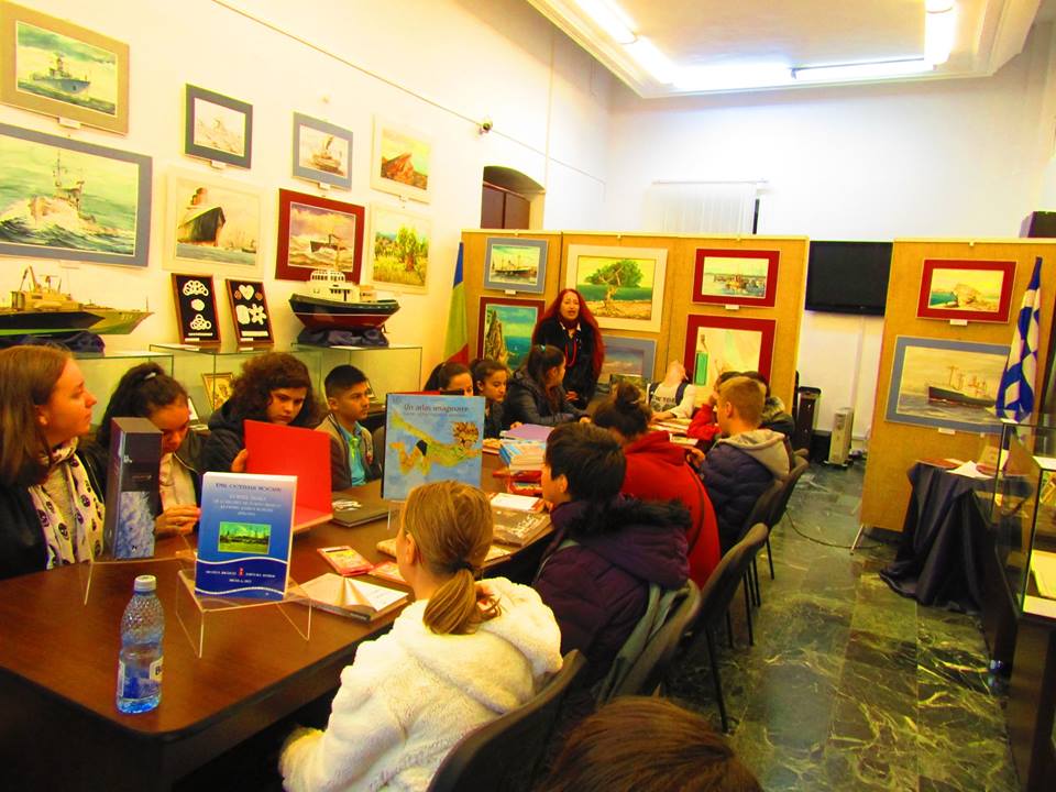 Elevii au vizitat expoziţia temporară „Călători pe Dunăre şi mare”. Pictură semnată Karl Robert Perko (Mangalia), artist plastic, membru al Uniunii Artiştilor Plastici din Europa şi din Rheinland-Pfalz │ Obiecte marinăreşti, hărţi, cărţi, documente din colecţiile unor membri ai Comunităţii Elene Brăila │Fotoexpoziţie cu imagini din arhiva Centrului Diversităţii Culturale şi de la muzee din Grecia │Navomodele din colecţia Palatului Copiilor Brăila │Obiecte marinăreşti din colecţia Flotilei Fluviale „Mihail Kogălniceanu” Brăila │ Panoplii, accesorii şi noduri marinăreşti, realizate de Costel Mândroiu.