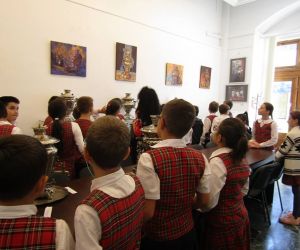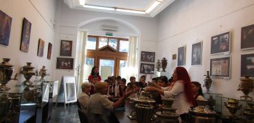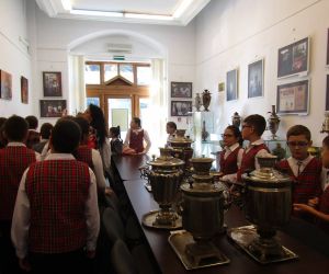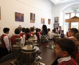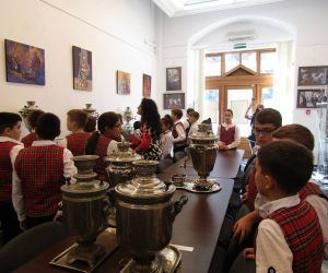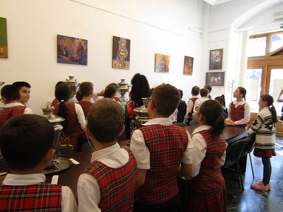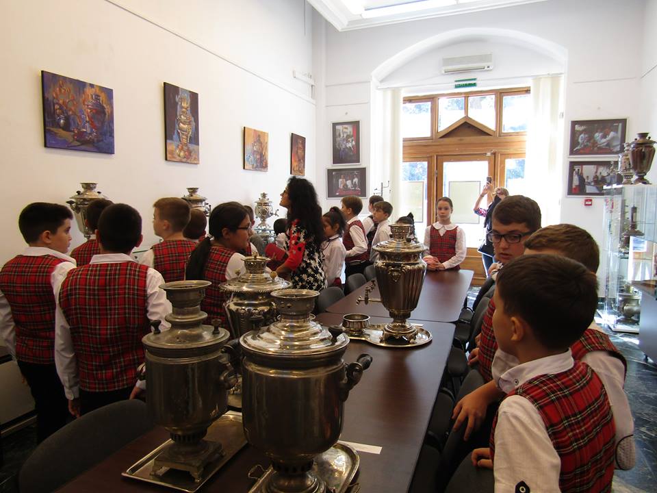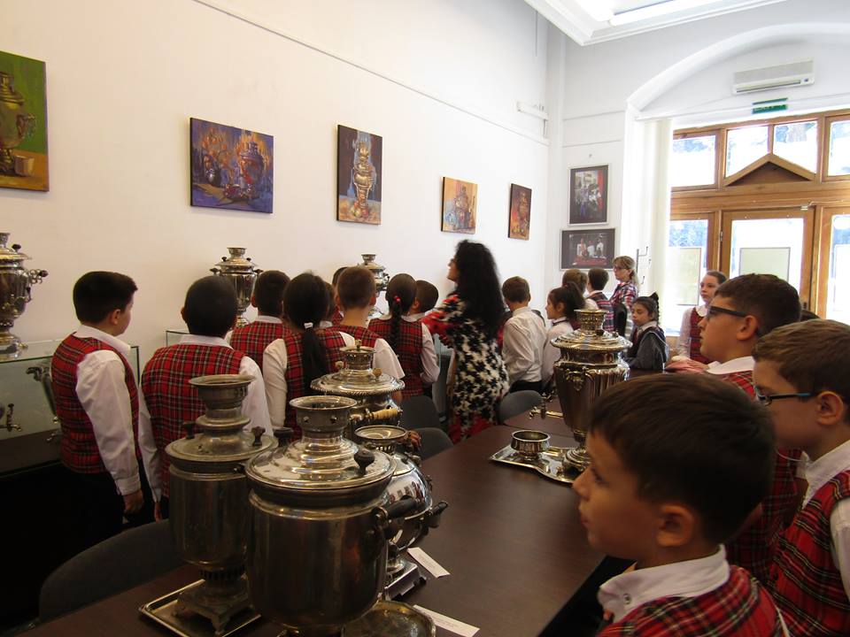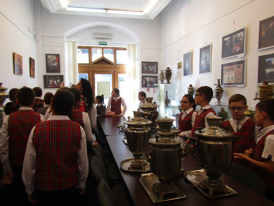 Elevii au vizitat expoziţia temporară „POVEŞTI ÎN JURUL SAMOVARULUI": Samovare, secolele XIX - XX. Colecţia George - Gabriel Chendea (Piatra Neamţ), provenind din ateliere celebre ca Batașev, Voronțov, Șemarin, Vanukin, Gutkovoi ș.a. din Rusia țaristă − cele mai multe din regiunea Tula, dar și din Moscova −, precum și din Polonia, respectiv din Cracovia și Varșovia | Baticuri cu broderie manuală şi accesorii. Colecţia Comunităţii Ruşilor Lipoveni Brăila | Pictură. Paul Petrov, artist plastic.