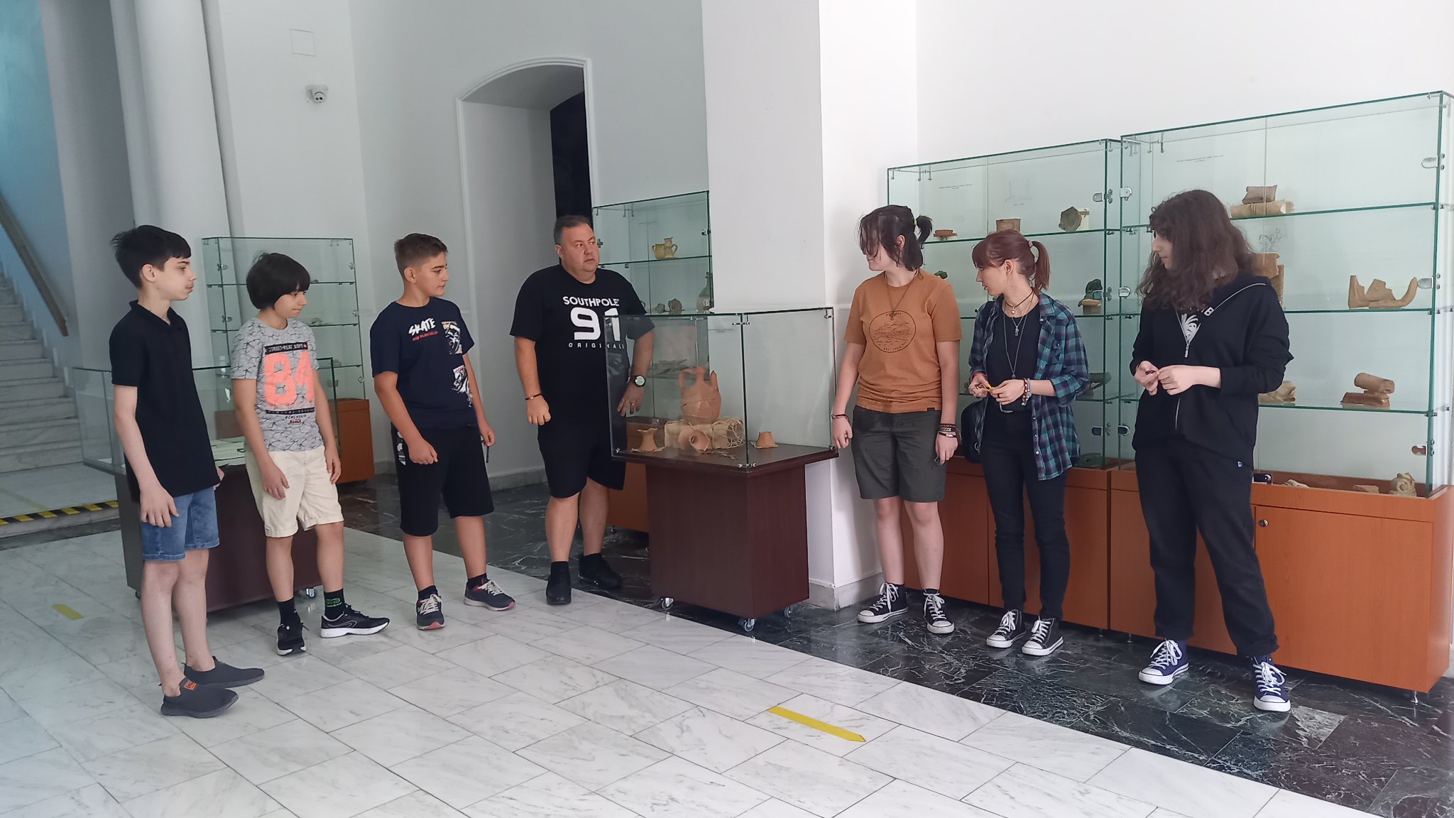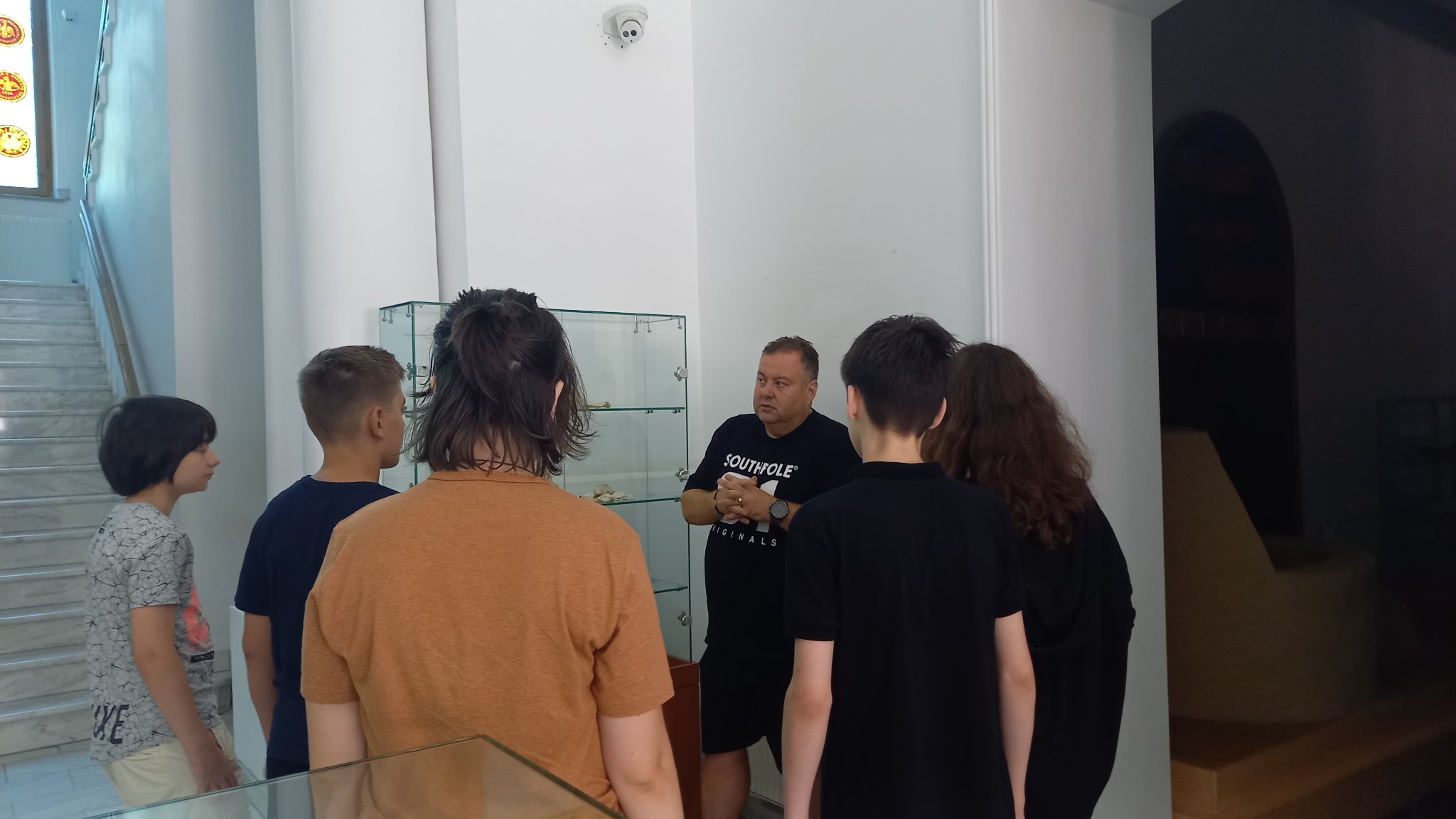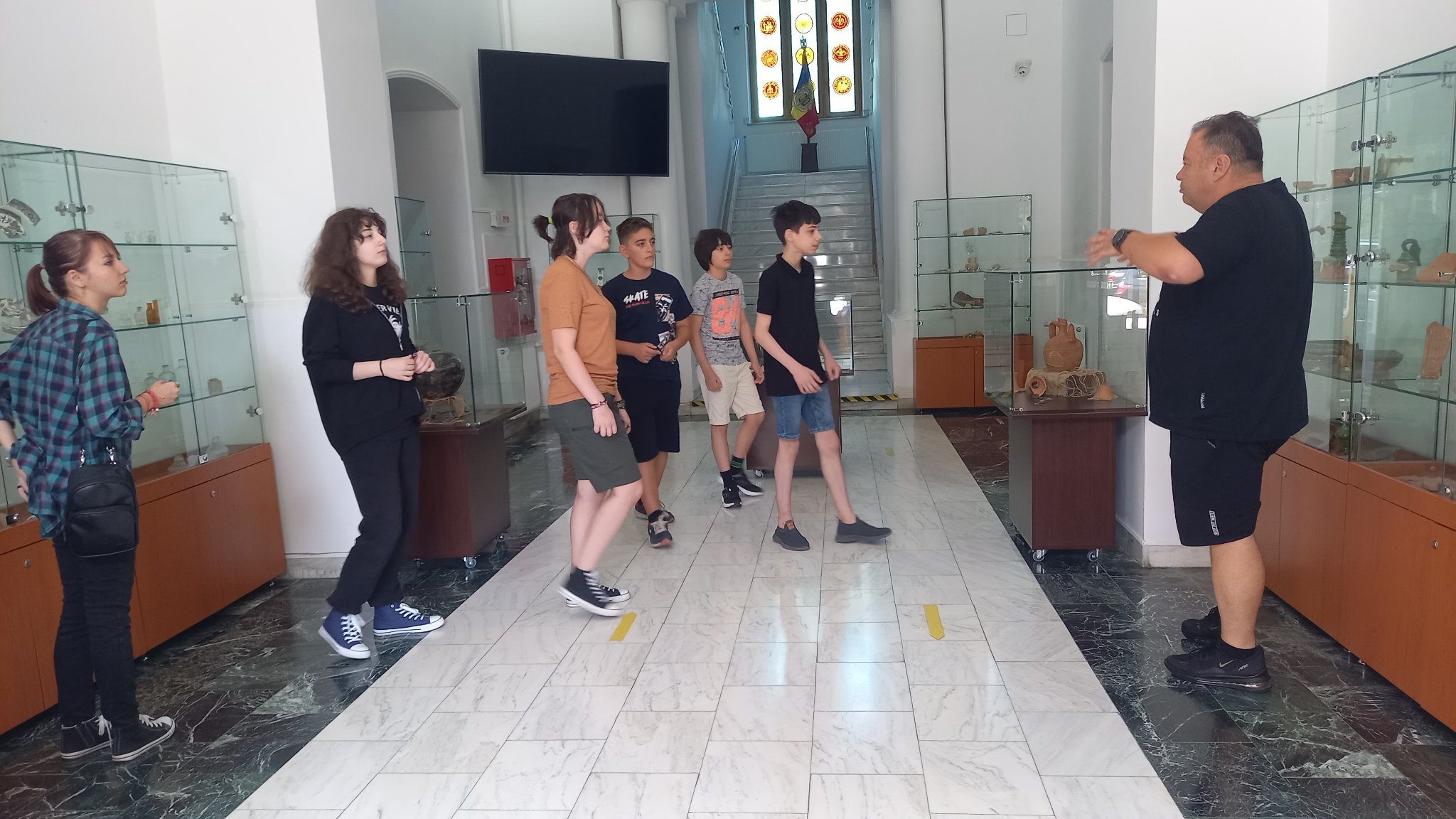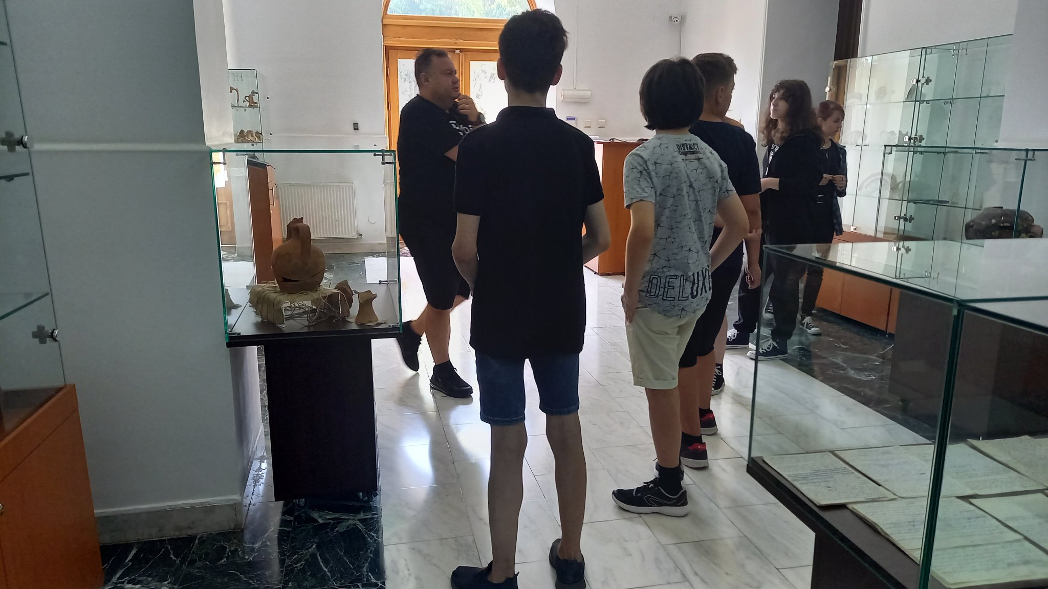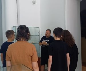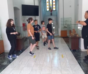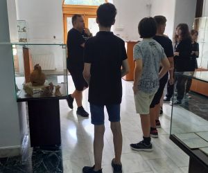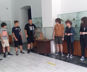 Vizitatori - participanții la atelierul „Arta Sticlei” - în expoziția „Din bube, mucegaiuri și noroi...”, obiecte descoperite în cercetările arheologice preventive desfășurate în limitele sitului arheologic Brăila – „Orașului Vechi”, deschisă la sediul Muzeului Brăilei „Carol I”.
