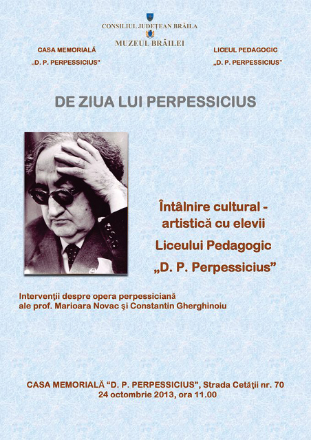 Anul acesta, în data de 24 octombrie, ora 11.00, la Casa Memorială „Dumitru Panaitescu Perpessicius” va avea loc o întâlnire cultural-artistică cu elevi și profesori ai Liceului Pedagogic „D. Panaitescu Perpessicius” Brăila.
