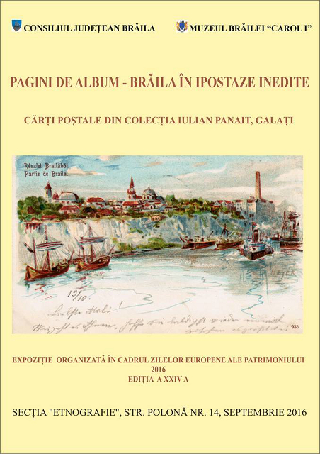 Vernisajul expoziţiei „Pagini de album - Brăila în ipostaze inedite". Cărţi poştale din colecţia Iulian Panait, Galaţi are loc vineri, 23 septembrie 2016, la Muzeul Brăilei „Carol I" - Secţia Etnografie (str. Polonă nr. 14).