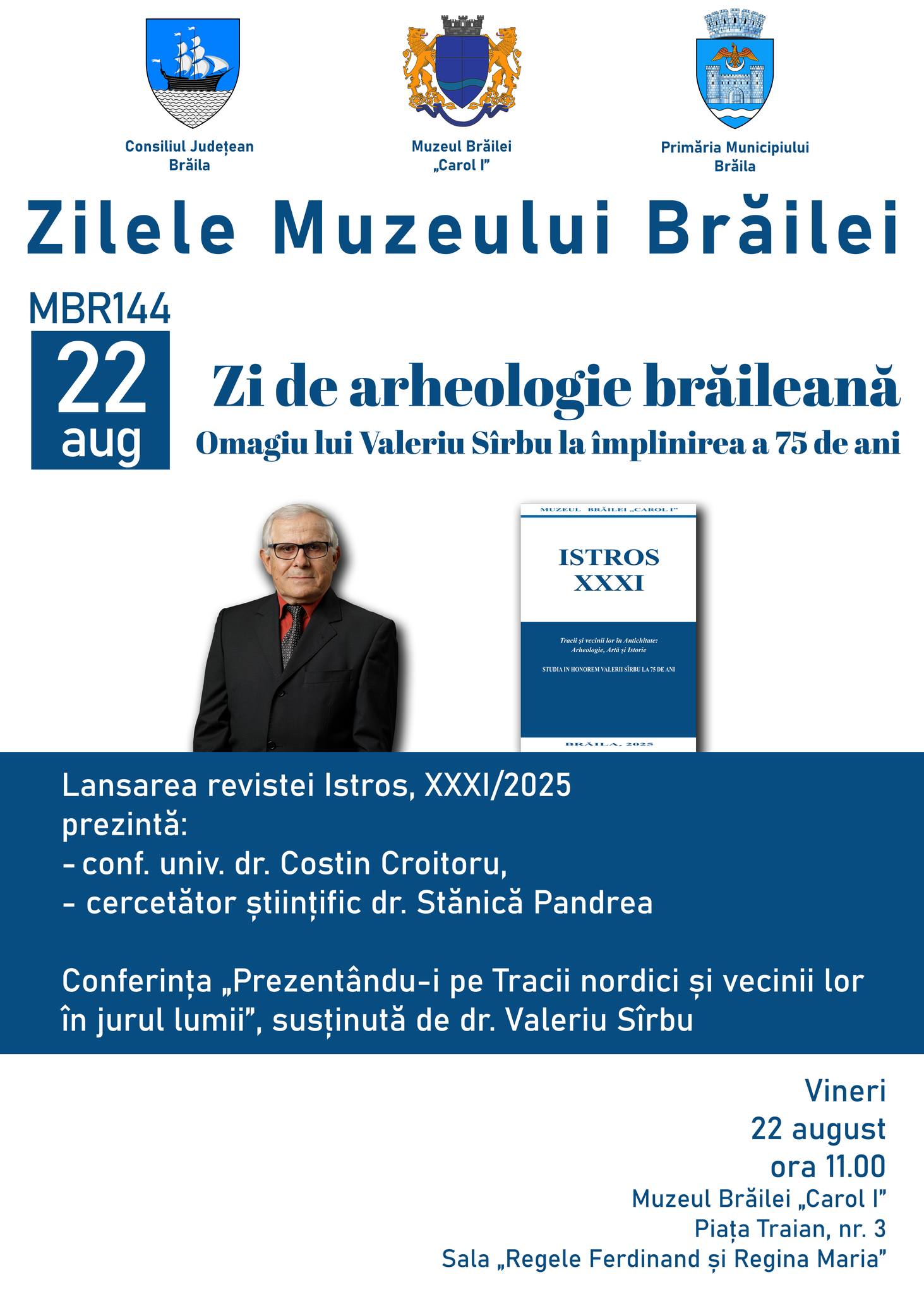 Zi de arheologie brăileană. Omagiu lui Valeriu Sîrbu la împlinirea a 75 de ani. Lansarea Revistei Istros, XXXI/ 2025, la sediul Muzeului Brăilei ,,Carol I" - Sala ,,Regele Ferdinand și Regina Maria, vineri, 22 august, ora 11:00. Au prezentat: conf. univ. dr. Costin Croitoru, managerul Muzeului Brăilei „Carol I"; dr. Stănică Pandrea, cercetător științific, șef Secția Cercetare, Documentare, Valorificare; dr. Cristian Schuster, cercetător la Institutul de Arheologie „Vasile Pârvan” al Academiei Române; prof. univ. dr. Ionel Cândea, fostul manager al Muzeului Brăilei „Carol I", membru corespondent al Academiei Române și scriitorul Vasile Datcu.