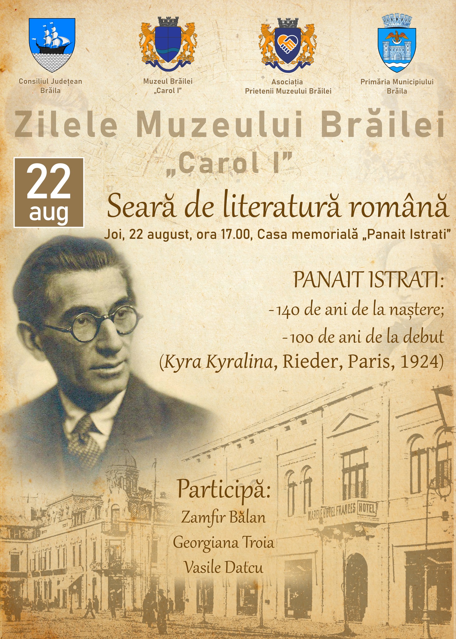 În cadrul evenimentului Zilele Muzeului Brăilei „Carol I”, joi, 22 august, ora 17:00, la Muzeul Brăilei „Carol I”, la Casa Memorială „Panait Istrati” din Grădina Publică se desfășoară o Seară de literatură română – „Panait Istrati: 140 de ani de la naștere, 100 de ani de la debut (Kyra Kyralina, Rieder, Paris, 1924)”; participă: Zamfir Bălan, Georgiana Troia, Vasile Datcu.