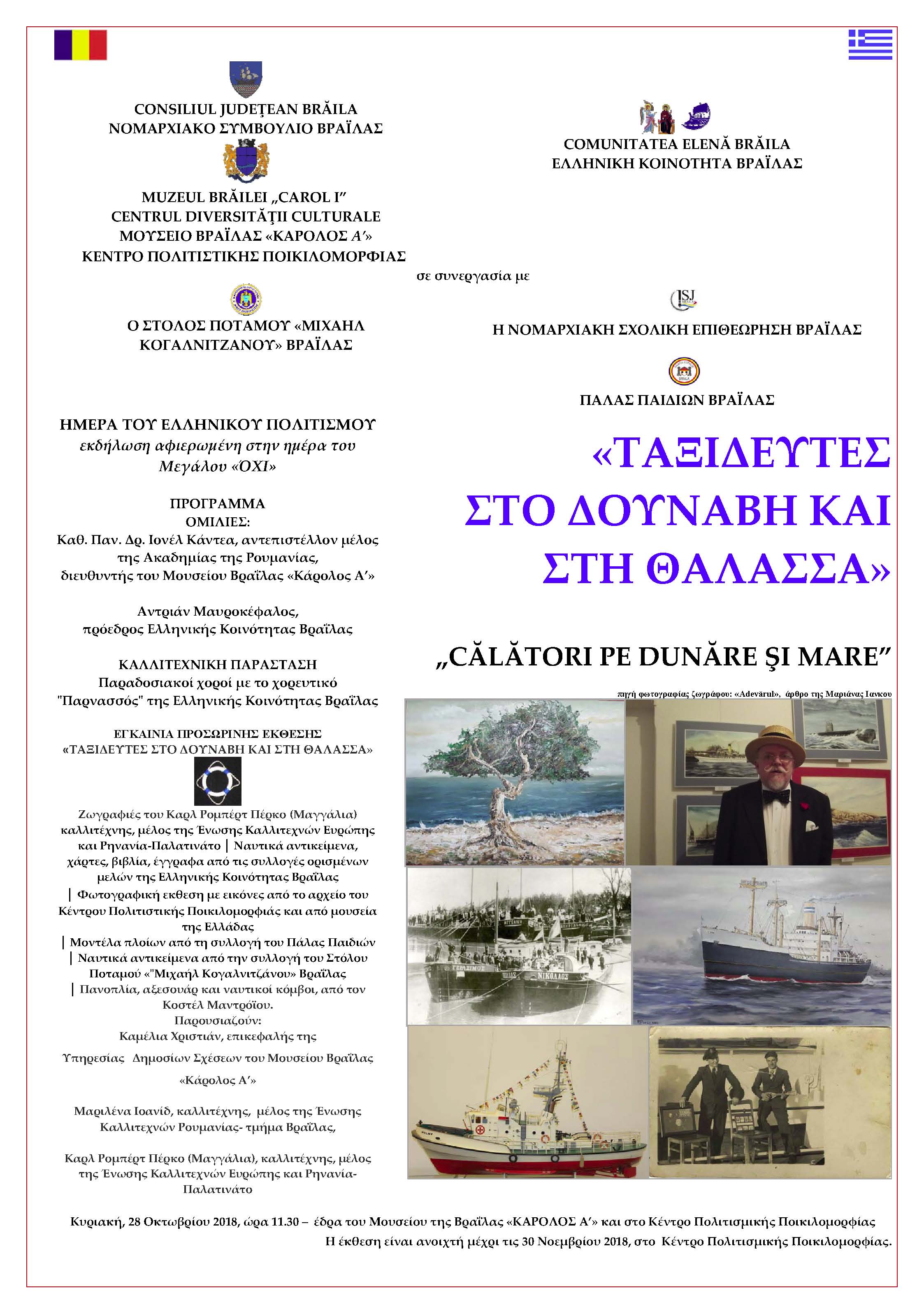ΗΜΕΡA ΤΟΥ ΕΛΛΗΝΙΚΟΥ ΠΟΛΙΤΙΣΜΟΥ, εκδήλωση αφιερωμένη στην ημέρα του Μεγάλου «ΌΧΙ»: Παραδοσιακοί χοροί με το χορευτικό "Παρνασσός" της Ελληνικής Κοινότητας Βραΐλας │ ΕΓΚΑΙΝΙΑ ΠΡΟΣΩΡΙΝΗΣ ΕΚΘΕΣΗΣ «ΤΑΞΙΔΕΥΤΕΣ ΣTΟ ΔΟΥΝΑΒΗ ΚΑΙ ΣΤΗ ΘΑΛΑΣΣΑ» − Κυριακή, 28 Οκτωβρίου 2018, ώρα 11.30 – έδρα του Μουσείου της Βραΐλας «ΚΑΡΟΛΟΣ Α’» και στο Κέντρο Πολιτισμικής Ποικιλομορφίας.