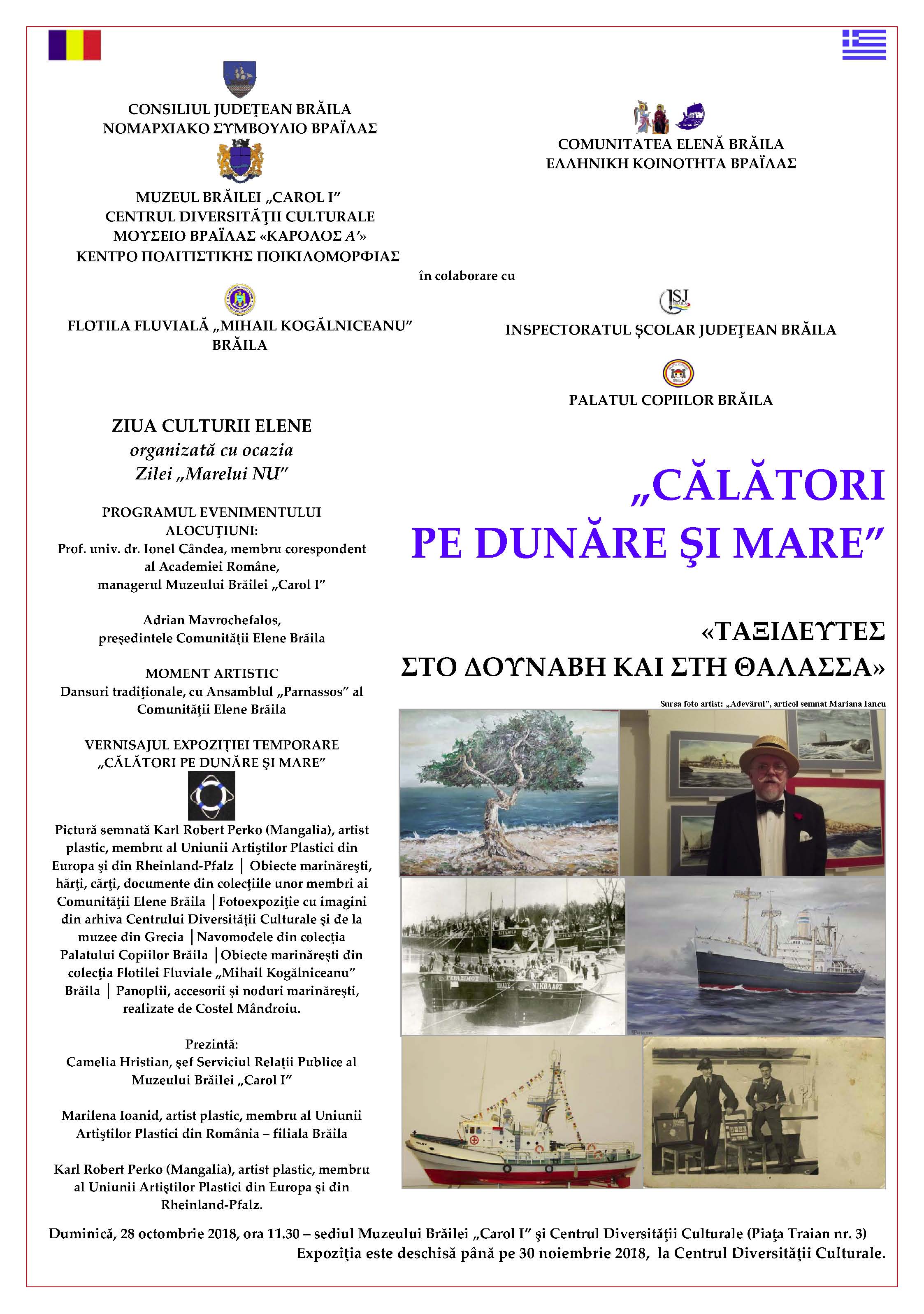 ZIUA CULTURII ELENE, cu ocazia Zilei „Marelui NU”. Vernisajul expoziţiei temporare „CĂLĂTORI PE DUNĂRE ŞI MARE”, la sediul Muzeului Brăilei „Carol I” şi Centrul Diversităţii Culturale