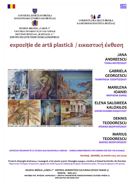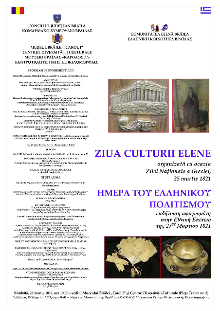 ZIUA CULTURII ELENE organizată cu ocazia Zilei Naţionale a Greciei, 25 martie 1821, la sediul Muzeului Brăilei „Carol I” şi Centrul Diversităţii Culturale / ΗΜΕΡA ΤΟΥ ΕΛΛΗΝΙΚΟΥ ΠΟΛΙΤΙΣΜΟΥ εκδήλωση αφιερωμένη στην Εθνική Επέτειο της 25ης Μαρτιου 1821, έδρα του Μουσείου της Βραΐλας «ΚΑΡΟΛΟΣ Α’» κ