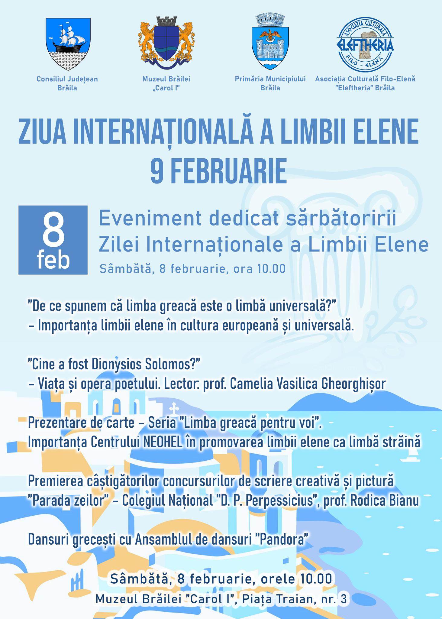 Sâmbătă, 8 februarie, la ora 10.00, Muzeul Brăilei „Carol I” a găzduit un eveniment realizat de Asociația Culturală Filo - Elenă „Eleftheria” Brăila: Ziua Internațională a Limbii Elene – 9 februarie.