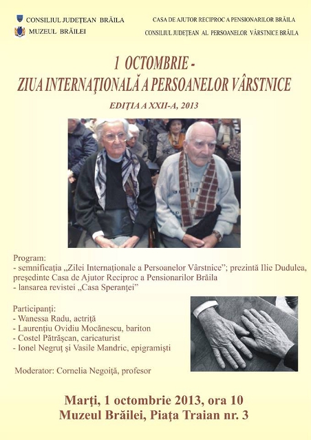 Marți, 1 octombrie 2013, ora 10.00, la sediul Muzeului Brăilei din Piața Traian nr. 3, va avea loc o manifestare dedicată "Zilei Internaționale a Persoanelor Vârstnice".