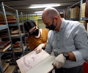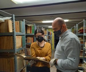 În imagini: dr. Costin Emilian Croitoru, manager și Laura Clara Coman, restaurator carte, în depozitul de carte veche al Muzeului Brăilei „Carol I”. Sunt verificate permanent condițiile de microclimat și starea de conservare a tipăriturilor.
