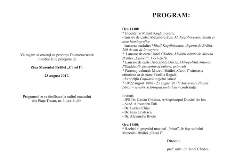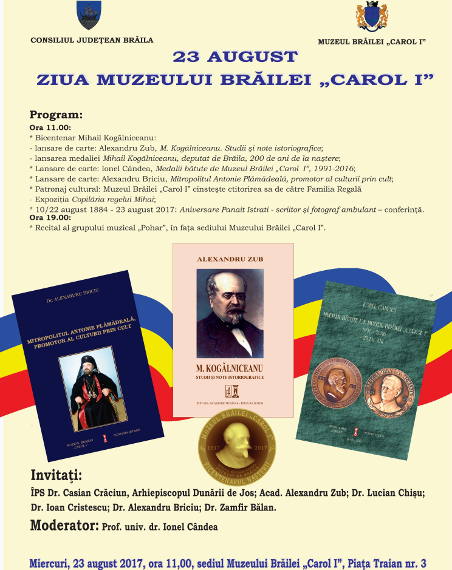 Muzeul Brăilei „Carol I” vă invită miercuri, 23 august 2017, ora 11.00, la sediul din Piața Traian nr. 3, pentru a participa la ZIUA MUZEULUI BRĂILEI „CAROL I”.