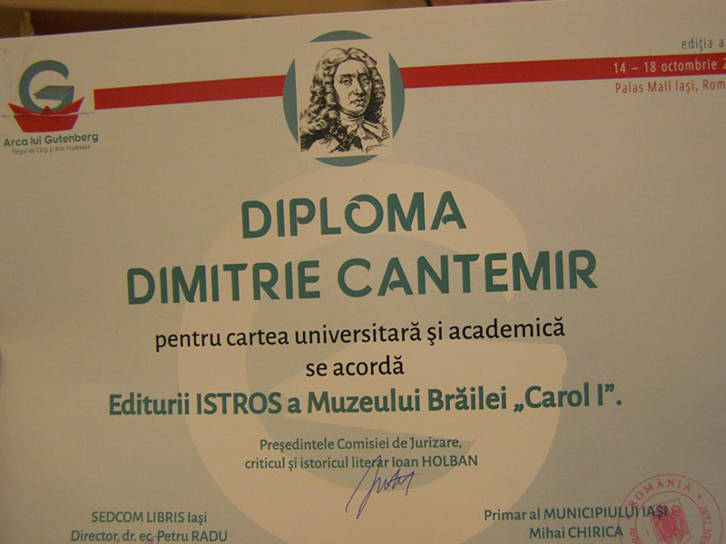 Editura „Istros” a Muzeului Brăilei „Carol I” a primit Diploma „Dimitrie Cantemir” pentru cartea universitară și academică, la Târgul de Cărți și Arte Frumoase „Arca lui Gutenberg”, ediţia a doua, Iaş